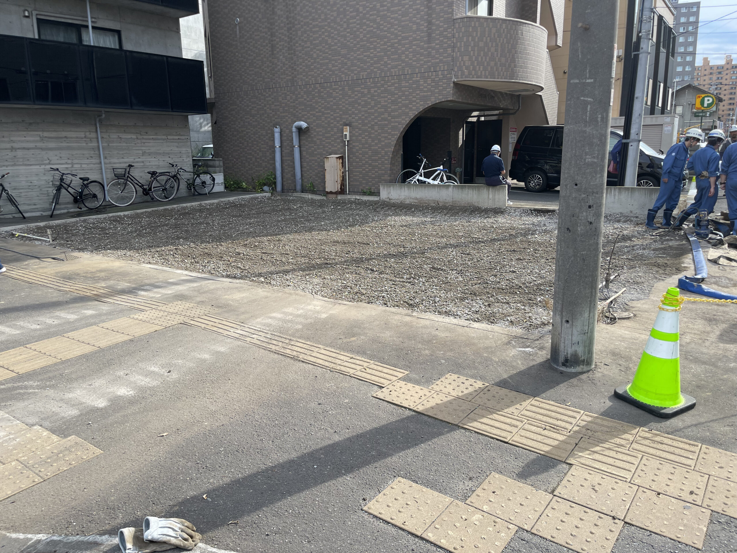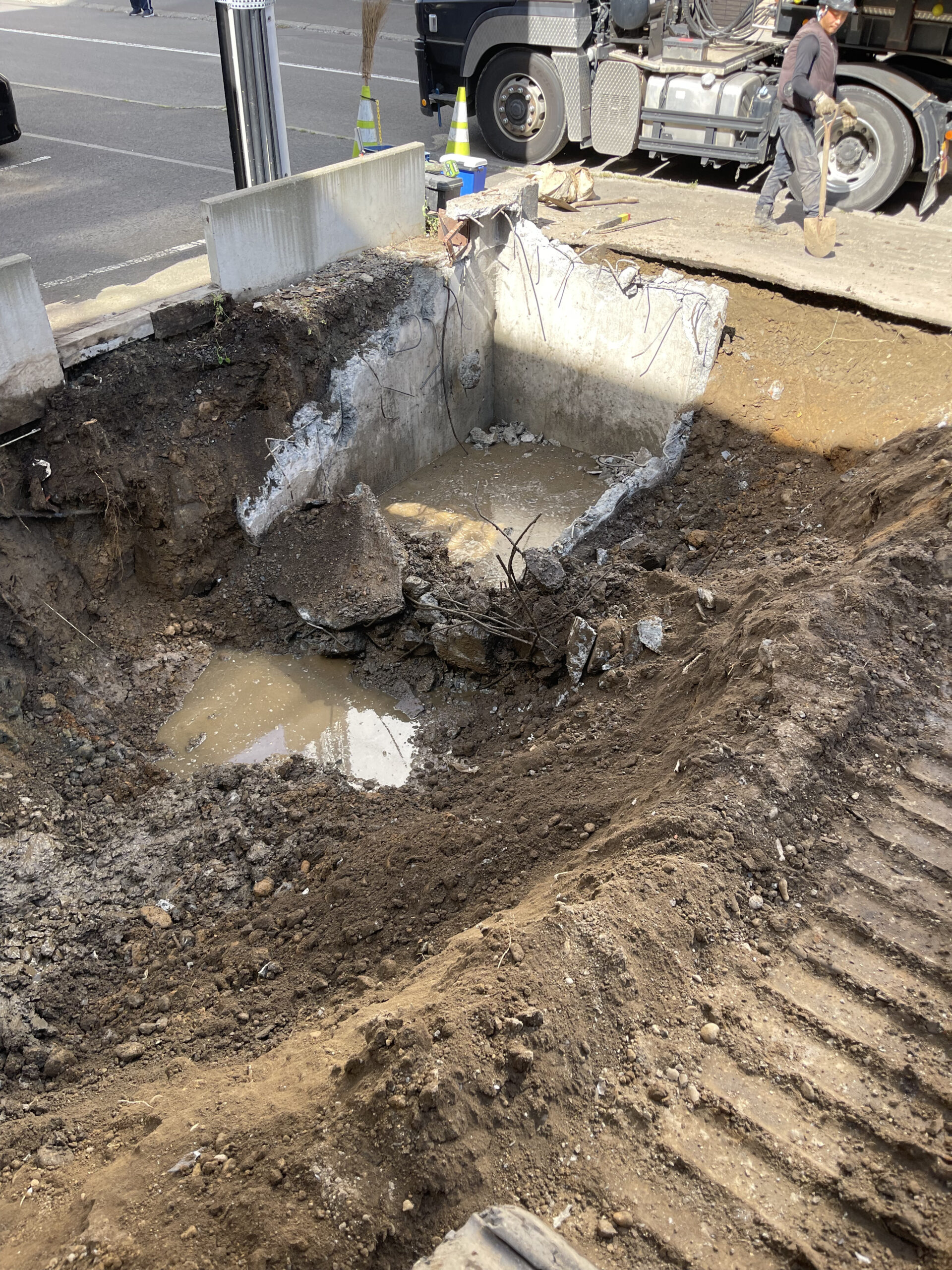 地下鉄の駅付近での解体で、敷地が狭く道路使用許可を申請し交通誘導員を配置しての解体でした。 基礎解体時に地下室が出てきたので埋め戻し工事もさせていただきました。
