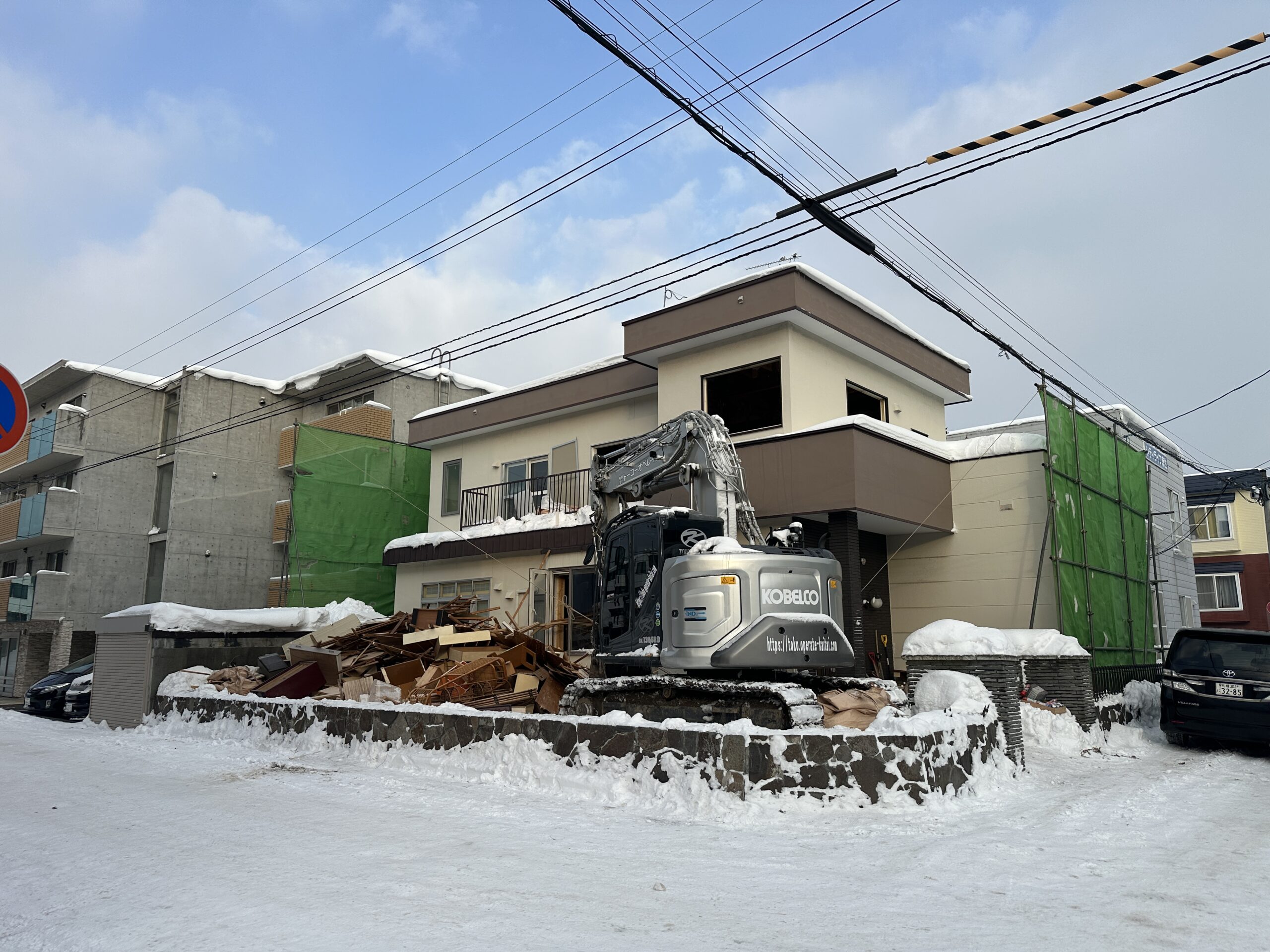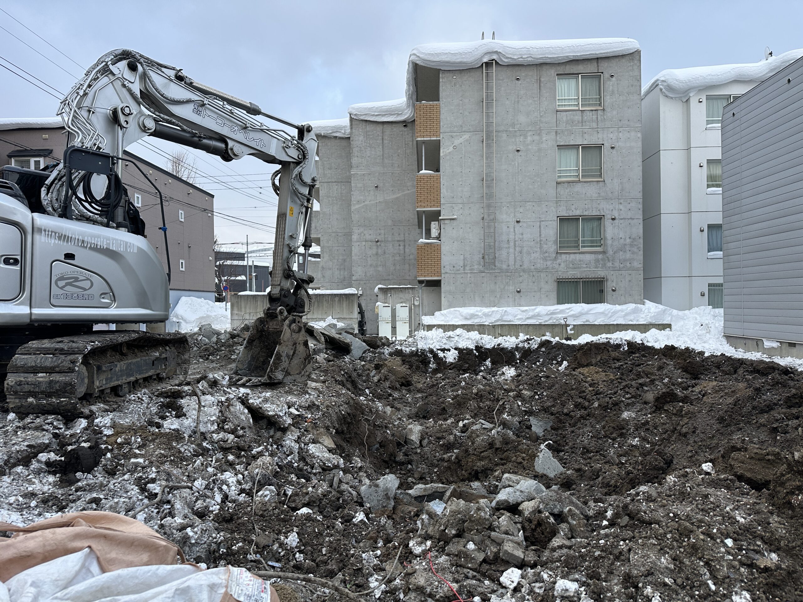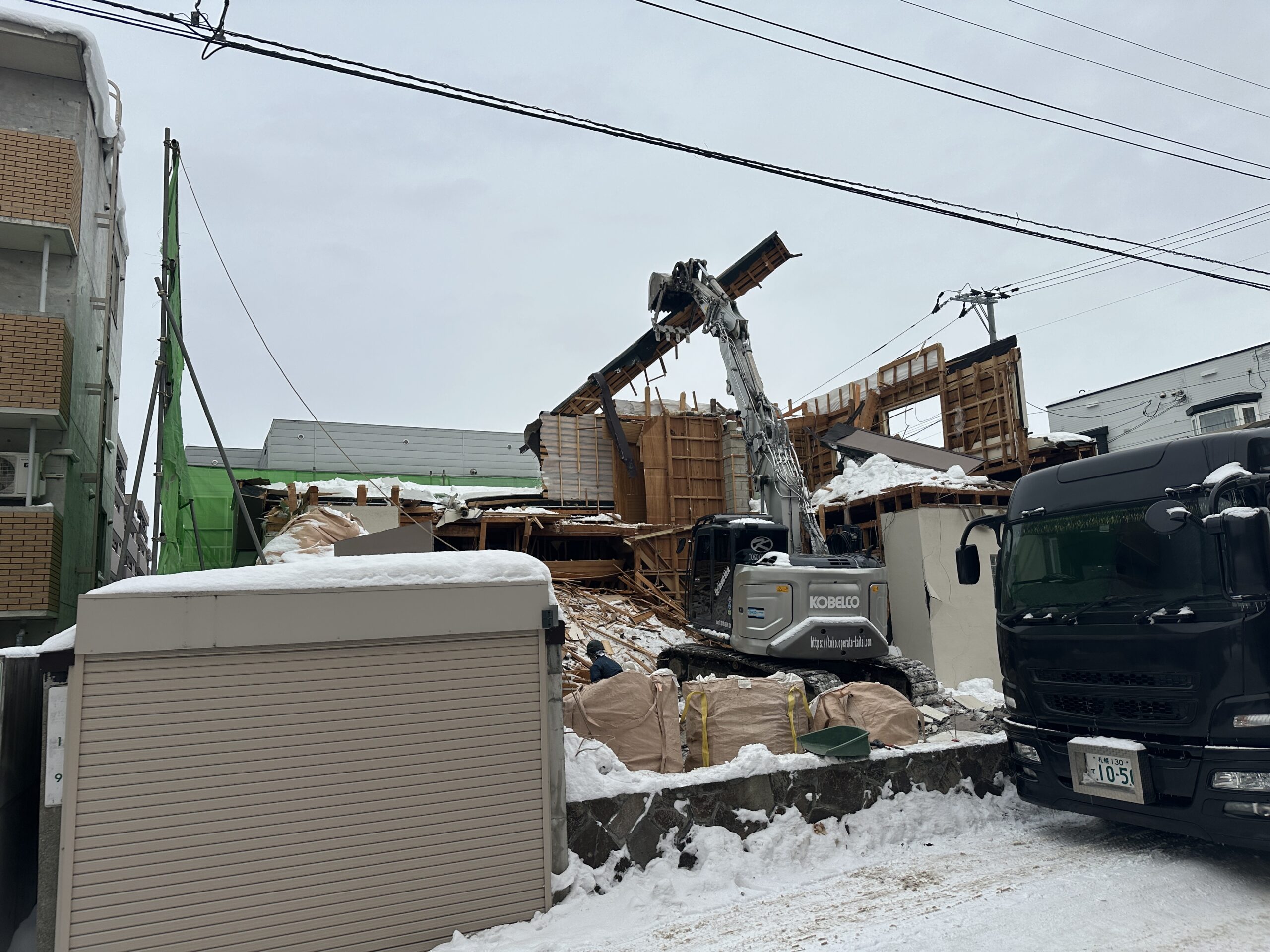 - 建物、コンクリートブロック車庫、塀、庭の解体の依頼でした。記録的大雪の期間の工事で道路は大渋滞、道幅が急に狭くなり、排雪作業をしながらの工事で通常の3倍の時間がかかりました。